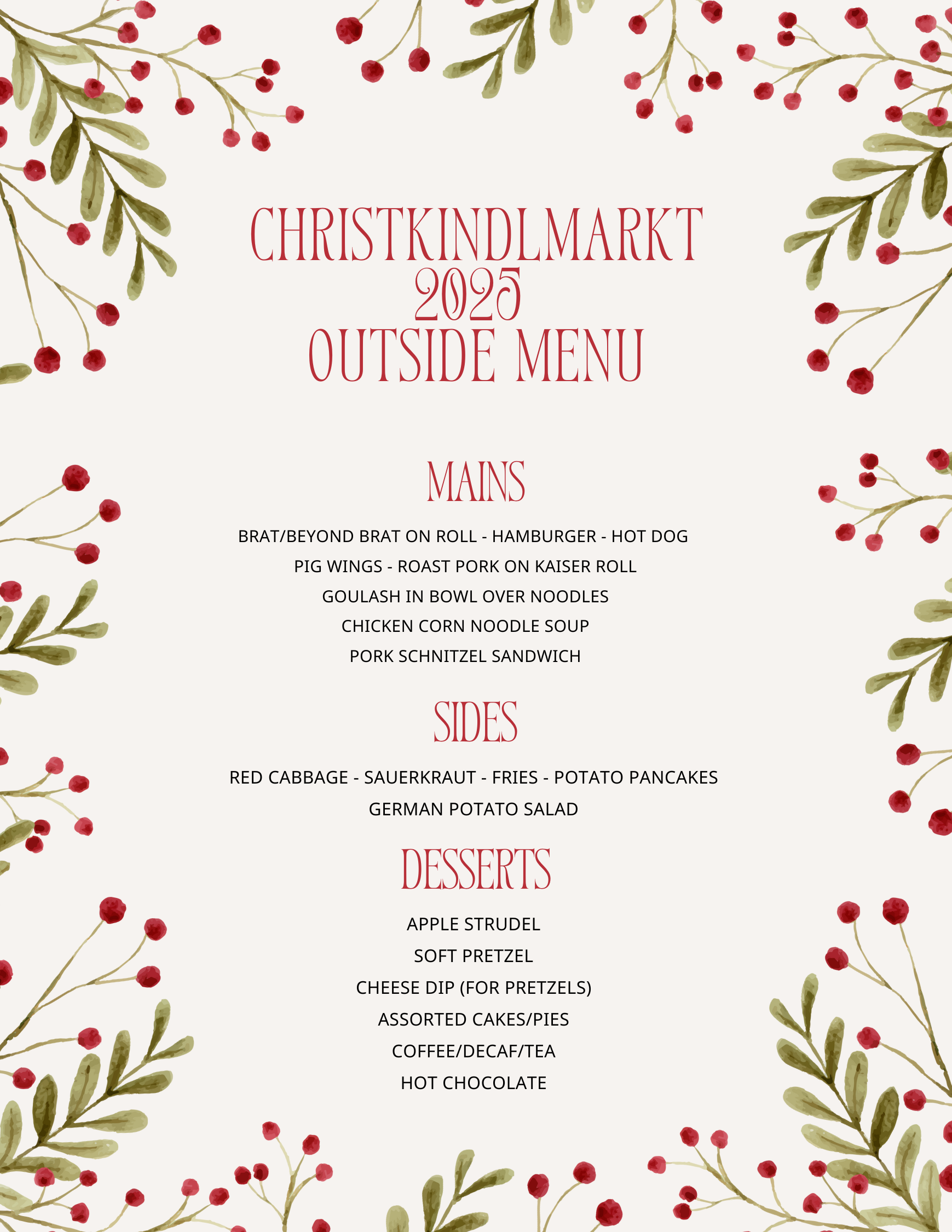 -Don't forget to try our Glühwein, a German spiced wine, served warm and guaranteed to warm your spirits!